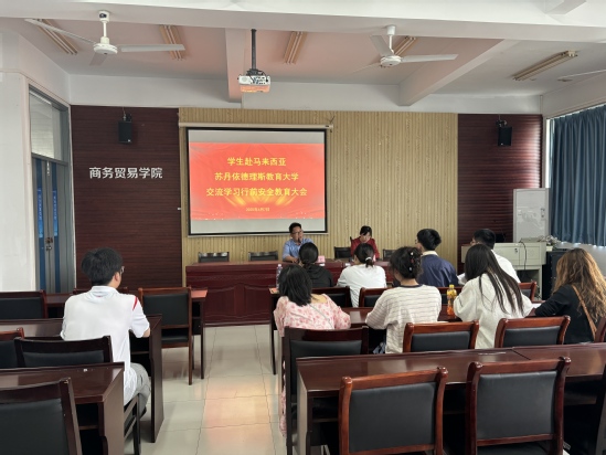 为强化赴马来西亚苏丹依德理斯教育大学交流学习学生的安全意识和认知,助力同学们更好地开启跨文化学习之旅,4月7日下午,商务贸易学院在求真楼404会议室开展出国交流学习行前安全教育大会。商务贸易学院院长阮晓文、国际合作与交流处邱丽满老师以及即将赴马交流的9名同学出席了会议。