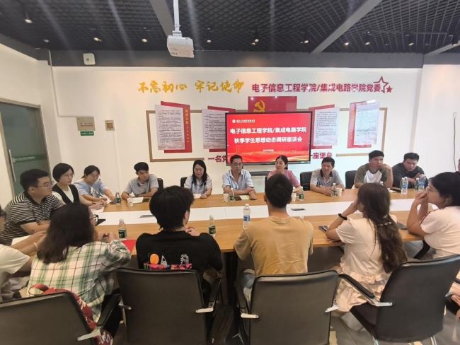为及时掌握学生新学期思想动态、生活及学习状况,切实解决学生实际问题,提升学生教育管理服务的针对性与实效性,9月3日,电子信息工程学院/集成电路学院在敬业楼113会议室举办了2025年秋季学期学生思想动态调研座谈会,关工委退休教师代表李金钟,学院党委书记、院长杨燕,党委副书记、副院长蒋丽洁,辅导员代表,教学秘书以及各年级学生代表参加会议。