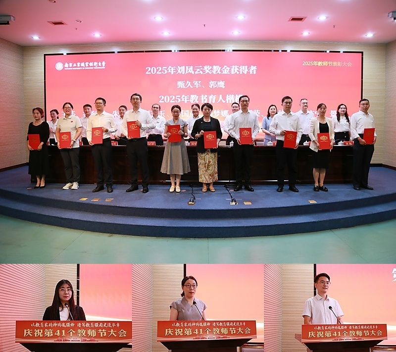 教师代表发言环节,2025年国家自然科学基金获得者、计算机与软件学院朱俊老师分享了来校后在学校政策和平台的大力支持下,致力于产学研用深度融合、协同创新,扎实推进教学与科研工作的经历与成果。教书育人楷模、商务贸易学院王莎老师围绕做“有使命”“有情怀”“有智慧”的教师,分享了从教23年来以课堂影响学生“一辈子”,用爱促进成长、用心搭建就业桥梁的育人故事。第二届全国大学生职业规划大赛金奖指导教师、艺术设计学院辅导员张庚龙分享了他以赛促教、潜心育人,带领学生多次走访企业、反复打磨作品,最终斩获国赛金奖,实现从青涩到成熟的成长历程与教育感悟。