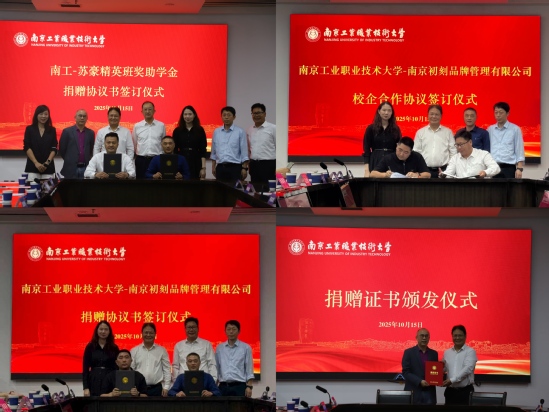 在与会人员的共同见证下,商务贸易学院党委书记邢益军与江苏苏豪国际集团股份有限公司总经理温金伟共同签订《南工-苏豪精英班奖助学金捐赠协议书》,苏豪国际集团股份有限公司每年将提供8万元人民币,用于奖励“苏豪精英班”优秀学生及资助贫困学生;商务贸易学院院长阮晓文与南京初刻品牌管理有限公司总经理张辉共同签订《南工-初刻校企合作协议》;邢益军与张辉共同签订《捐赠协议书》。何学军代表学校为两家企业颁发捐赠证书,感谢企业对学校教育事业的大力支持。