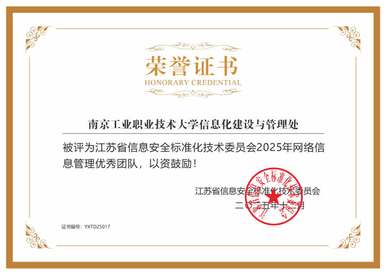 近日,江苏省信息安全标准化技术委员会表彰了2025年度在网络信息管理工作中表现突出的团队。永利官网信息化建设与管理处获评“2025年网络信息管理优秀团队”。