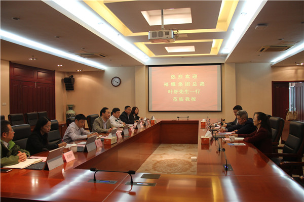 10月23日,福耀玻璃工业集团股份有限公司总裁叶舒一行来永利官网交流。永利官网党委书记吴学敏、副校长崔新明以及党政办、科技处、招就处、机械学院、电气学院等相关负责人接待了来宾。