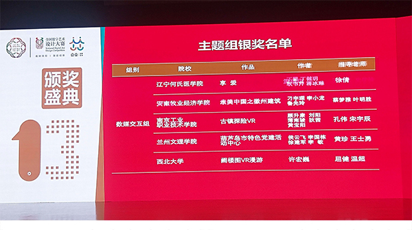 艺术设计学院组织参加的第十三届“全国数字艺术设计大赛”是年初教务处立项的校外大学生竞赛项目,已经连续参加了9届,提高了老师和学生的专业水平。其中,孔伟和宋宇辰老师指导的数媒1711班刘阳、顾升康等多位同学制作的作品《乡愁》和《古镇探险》分别获得视频拍摄组银奖和数媒交互组银奖(奖金共16000元);学术组由叶中亮老师获得银奖一项、钱海月和任小飞老师获铜奖两项。此外孔伟教授获优秀指导教师奖,同时被聘为中国电子视像行业协会数字影像创意委员会高级专家,并作为嘉宾为获奖学生颁奖。