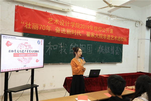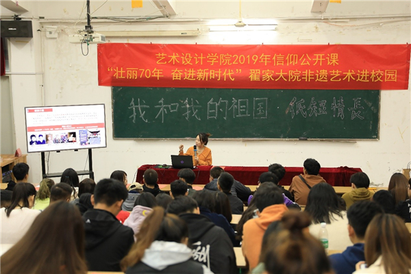 10月28日晚,艺术设计学院团总支特邀徐州翟家大院撕纸艺术非遗文化传承人翟天麟,为同学们带来了一堂主题为“壮丽七十年 奋进新时代”的信仰公开课。艺术设计学院200多位同学齐聚敬业楼阶梯教室,感受中国传统文化撕纸艺术的独到魅力。