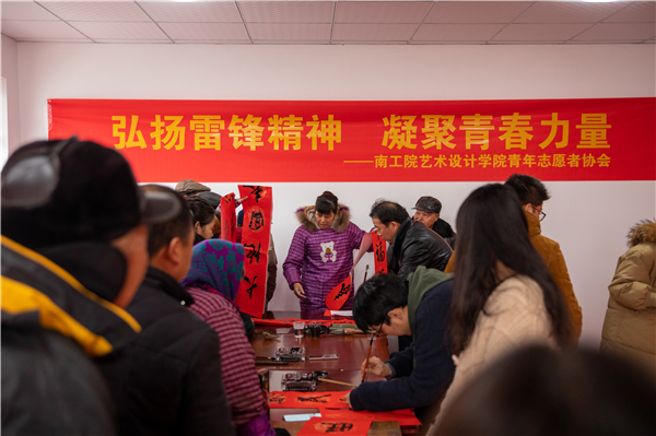 春节将至,年味愈浓。为提高学生服务社会的意识,弘扬中华传统文化,助力新农村文化建设,1月2日,恰逢传统“腊八节”,南工院艺术设计学院青年志愿者协会、书法社团以及师生第一党支部的老师和同学们,冒着严寒前往句容市边城镇赵村开展了送“福”字、送春联活动。