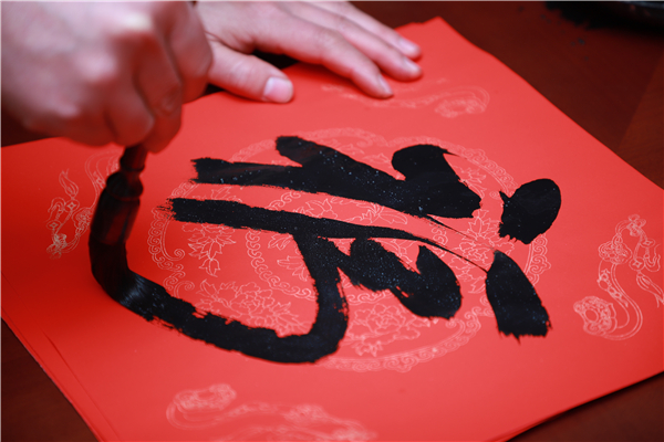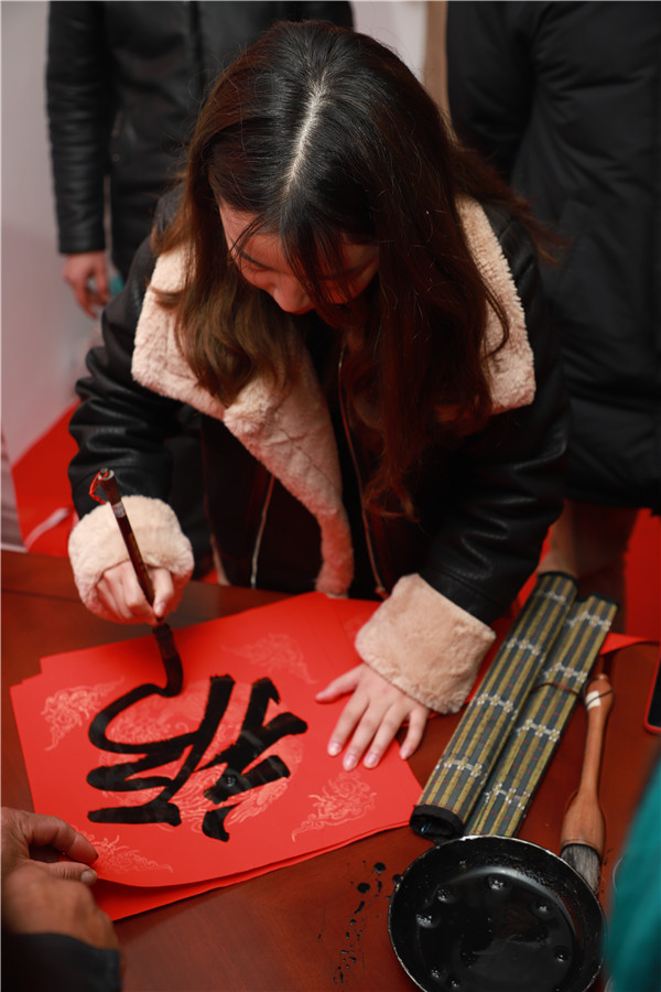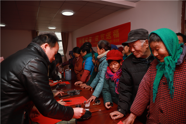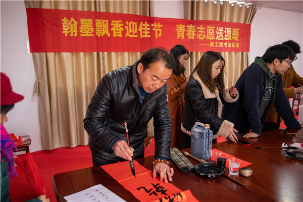 在近两个小时的时间里,老师、同学们为当地村民书写了近200幅春联和“福”字,传递了最诚挚的问候和最美好的新春祝福。鲜艳的红纸、飘香的翰墨、喜悦的脸庞、浓浓的情谊,增添了现场喜庆祥和的新春氛围。