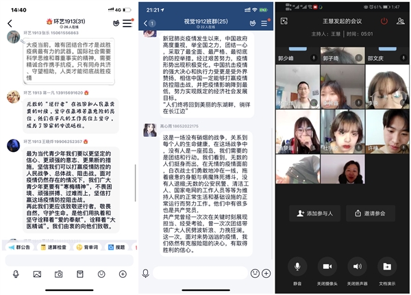 环艺1913团支部在支部QQ群中开展了这次团日活动,活动由团支部书记刘淇主持。同学们在QQ群中畅所欲言,分享自己的五四感悟,通过本次团日活动,支部团员对“五四运动”、“五四精神”有了更深刻的认识,增强了制度自信;视觉1912团支部书记高宇飞在团日活动中呼吁班级学生要减少不必要的外出与聚会,不轻信来历不明的防疫方法,不传播无法证实的虚假消息。遵循权威信源的专业建议,践行最合理的防疫方法,认真做好个人防护,在保护好自己的前提下践行五四精神,为打赢疫情防控阻击战贡献力量;数媒1911团支部使用企业微信云视频的方式开展了这次团日活动,同学们集体学习“五四运动”的知识,深入了解“五四精神”的时代内涵;室内1821团支部的青年团员们在活动中集体学习习近平总书记给北京大学援鄂医疗队全体90后党员的回信,支部的团员青年们手举标语口号,表示要坚定思想信念、明确行动方向,不忘初心、牢记使命、扛起责任、经受考验,争做新时代的南工院青年。