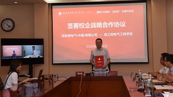 5月29日,电气工程学院与施耐德电气(中国)有限公司以“云签约”的形式签署战略合作协议。本次云签约活动由永利官网科技处、发展合作处处长孟庆杰主持,学校党委委员、副校长崔新明,电气工程学院院长杨战民,施耐德电气工业自动化业务副总裁、OEM业务负责人崔志达,科技处、发展合作处、机械工程学院、电气工程学院、航空工程学院、商务贸易学院、艺术设计学院以及各签约企业相关负责人出席了签约仪式。