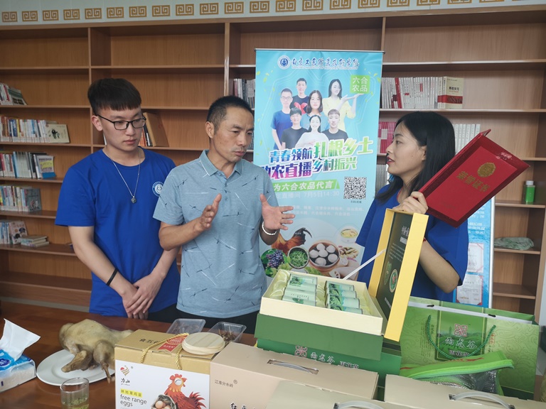 江淮分水岭籼稻、冶山贡鸡生态养殖基地、金牛湖的葡萄、峨嵋山的茶叶、东沟的盐水鹅、六合蟹黄汤包……近日,国际教育学院师生代表队上山头、下农田,全力帮扶六合区当地经济薄弱村农户开展特色农产品线上销售和推广活动,以“学生+农户”在线直播带货的形式,推荐江淮风水岭稻米、冶山贡鸡、金牛湖葡萄、东沟盐水鹅等六合特色农产品通过云端“飞”往全国各地,为农产品销售助力,从而助农富农,彰显出青年学子推动乡村振兴的社会责任和智慧担当。