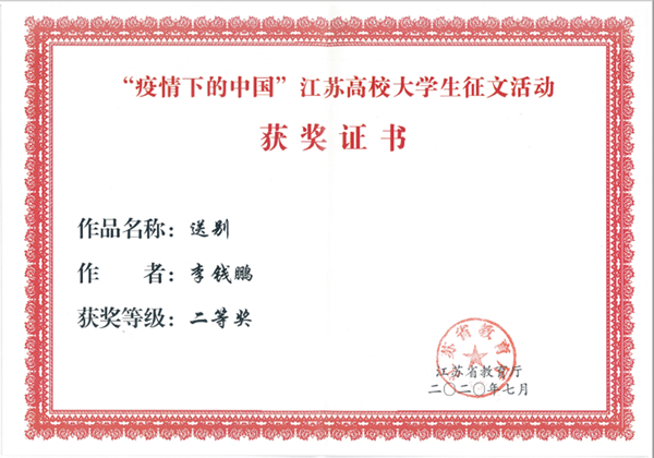 自活动开展以来,全校学生积极参与,经各学院初审,学校评选,共推选参评3篇征文作品,作品记录了同学们在疫情防控期间的难忘时刻和心路历程,讲述了抗疫期间人与人之间的温暖善意和真挚情感,书写了身边的抗疫感人事迹,强化责任与担当,树立爱国主义情怀,坚定决胜信心,传递出众志成城、共克时艰的强大正能量。最终永利官网电气工程学院电气1814班李钱鹏同学的文章《送别》获得了省赛二等奖,建智1911班姜仟晨同学的文章《春树》获得省赛三等奖。