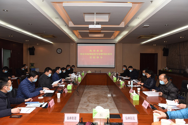 1月22日上午,南京市疫情防控督导组在市政协港澳台侨和外事委员会副主任毛卫华组长带领下,对永利官网新冠疫情防控工作进行专项督查,大学城管委会党工委委员、副主任孙金娣,以及管委会相关部门负责同志陪同督查。学校党委常委、副校长崔新明,疫情防控办相关部门负责同志参加现场督查和座谈。