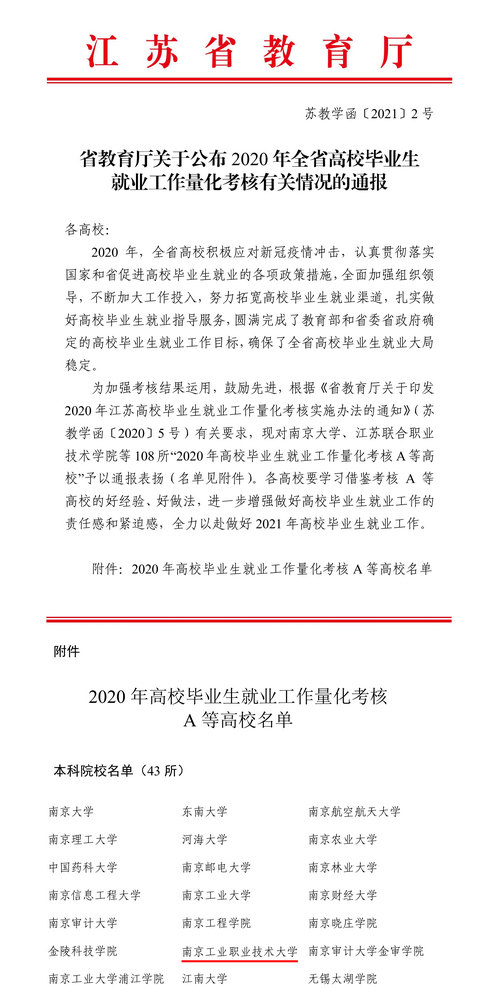 江苏省教育厅近日下发了《关于公布2020年全省高校毕业生就业工作量化考核有关情况的通报》(苏教学函[2021]2号),对认真贯彻落实国家和省促进高校毕业生就业的各项政策措施,加强组织领导,加大工作投入,努力拓宽高校毕业生就业渠道,扎实做好毕业生就业指导服务,圆满完成既定就业工作目标的高校予以通报表扬。永利官网荣获2020年毕业生就业工作量化考核“A”等次。