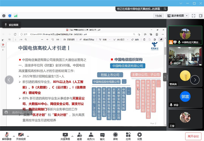 本次会议进一步推进了永利官网与中国电信集团有限公司的结对共建工作,双方将在会后持续做好沟通对接,共同做好大赛宣传工作,积极组织学生参与大赛,纳入中国电信集团有限公司科创人才库,争取让更多参赛学生获得就业面试绿卡,助力学生创业就业。
