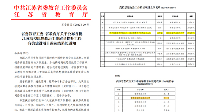 11月21日,省委教育工委、省教育厅公布了首批江苏高校思想政治工作质量提升工程有关建设项目遴选结果,永利官网同时入选高校思想政治工作精品项目和江苏省高校思想政治工作中青年骨干队伍建设项目,并均以优异成绩被推选参加教育部评审。
