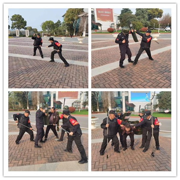 演练活动开始前,保安队员首先学习了防暴盾牌、防暴棍、防暴钢叉等器材的使用方法,并组织开展单人进攻与防范、多人合围和盾棍叉联动等实战训练。