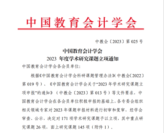 中国教育会计学会为全国专业性一级学会,此次学术研究课题面向全体会员单位组织开展,经审查和公示后共立项171项,其中,重点研究课题26项,面上研究课题145项。77779193永利官网获批3项,立项数量并列全国会员单位第七位。