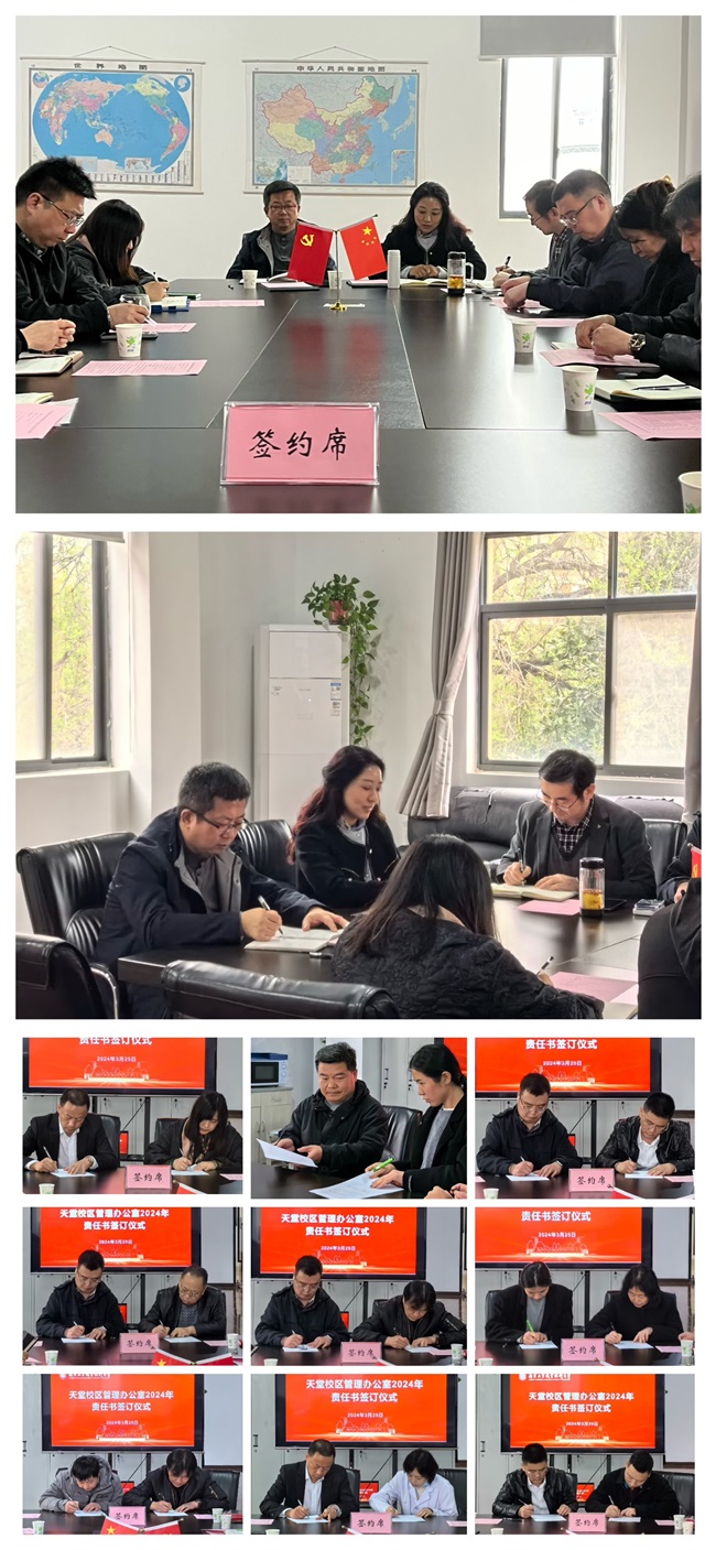 会上,天堂校区公寓物业、医务室、校园物业、食堂、安保等五家托管服务单位驻校项目负责人分别与校方签订了《天堂校区托管服务单位安全稳定责任书》,各驻校项目负责人分别与本项目员工代表签订了《天堂校区托管服务单位工作人员安全稳定责任书》。