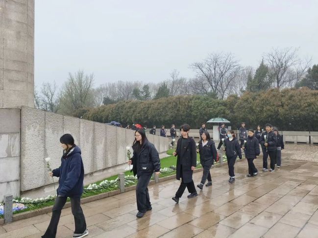 面对庄严的雨花台革命烈士纪念碑,全体团员青年整齐列队,重温了入团誓词。在周歆同学的领誓下,大家面对鲜艳的团旗,高举右拳,铿锵有力地重申入团誓言,呐喊出新时代共青团员的郑重承诺。随后,同学们手持洁白的花束,满怀敬仰之心地瞻仰雨花台革命烈士纪念碑,虔诚地敬献祭奠之花,以此缅怀那些为了国家独立、民族解放和人民幸福而英勇捐躯的革命先烈。