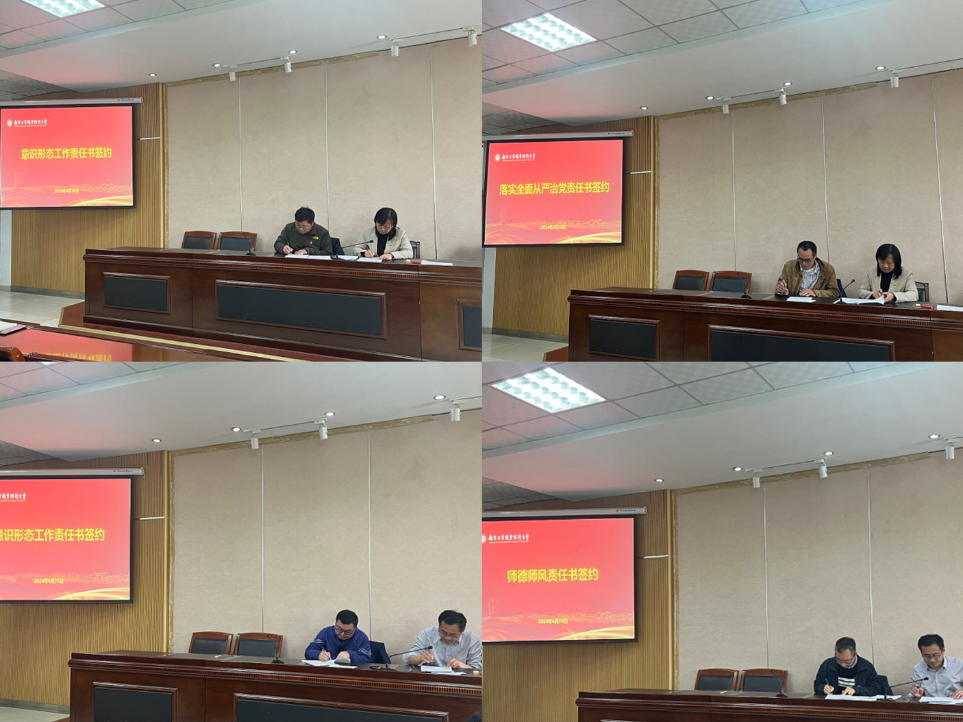 学院党政负责人刘英慧、胡光永分别与学院领导班子成员、党支部书记、系主任、科长代表签订《全面从严治党责任书》《意识形态工作责任书》《师德师风责任书》《安全稳定责任书》《网络安全责任书》。全体教师共同签订了《意识形态工作责任书》《师德师风承诺书》《安全稳定责任书》和《网络安全责任书》。