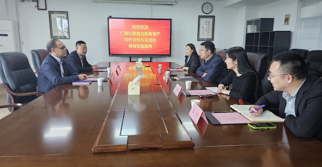 4月17日下午,广西壮族自治区教育厅对外合作与交流处处长罗耀光一行访问永利官网。永利官网党委常委、副校长孙雁飞于行政楼401会议室接待了来宾,国际教育学院相关负责人员参加座谈。