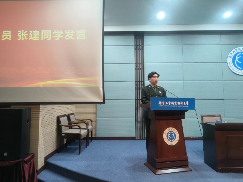 服役8年、参加过国庆70周年大阅兵的张建同学代表学生宣讲员发言,他讲述了自己的军营故事,并表示将积极宣传国防知识,让更多的同学关心国防、热爱国防,不断提高国防意识,积极参军入伍。