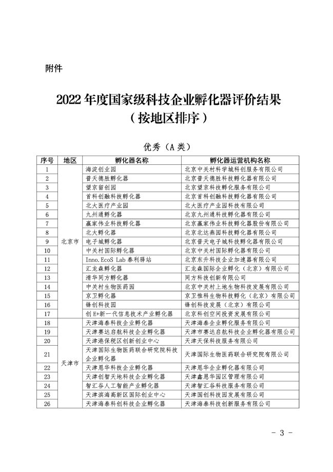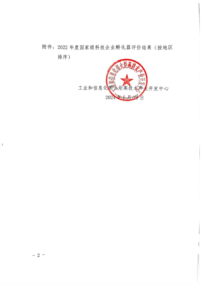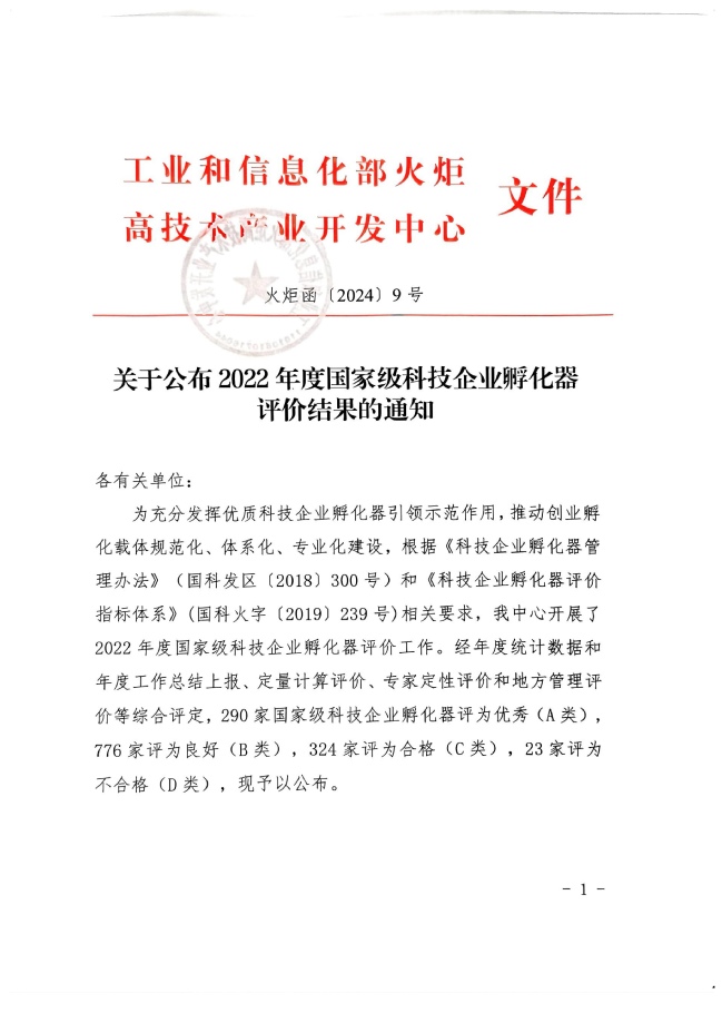 近日,工业和信息化部火炬高技术产业开发中心发布了《关于公布2022年度国家级科技企业孵化器评价结果的通知》(火炬函〔2024〕9号),此次评价中共有290家国家级科技企业孵化器被评为优秀(A类),776家被评为良好(B类),324家被评为合格(C类),23家被评为不合格(D类),其中77779193永利官网科技园被评为“优秀(A类)”。
