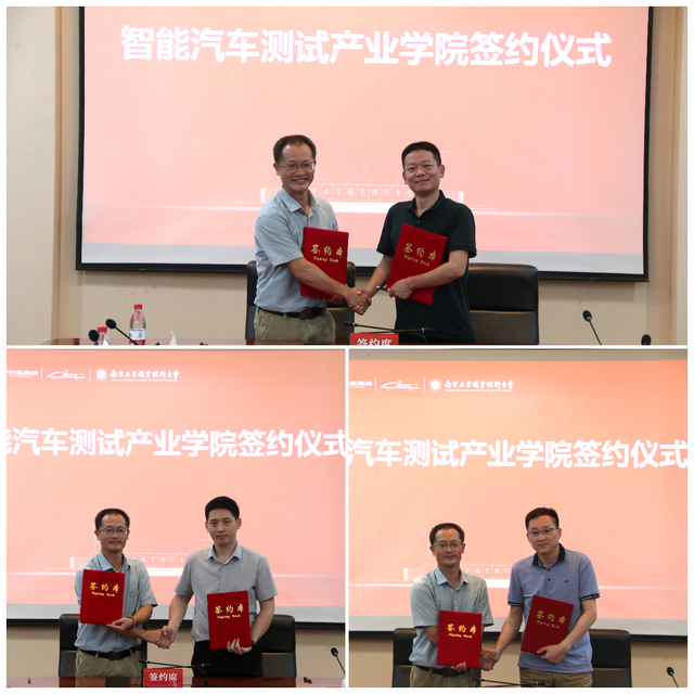 在全体参会人员的见证下,孙雁飞与企业代表为智能汽车测试产业学院(企业学院)揭牌。交通工程学院党委副书记、院长王文凯与三家企业代表分别签订了校企战略合作框架协议。这标志着校企双方将在人才培养、科研合作、技术创新等方面展开深入合作。